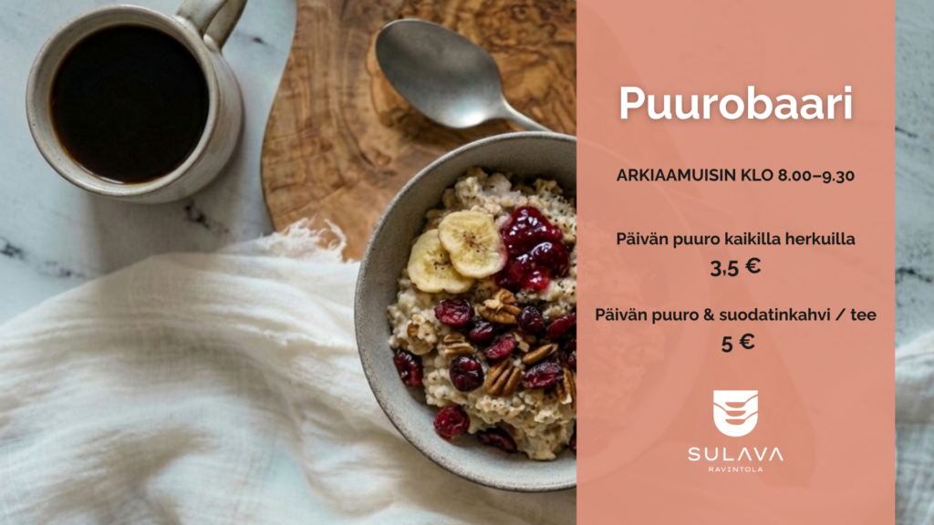 Aloita aamu tasapainoisesti Sulavan Puurobaarissa. Tarjolla päivittäin vaihtuvia, täyteläisiä puuroja sekä herkullisia lisukkeita, joista kokoat juuri sinulle sopivan aamupalan.